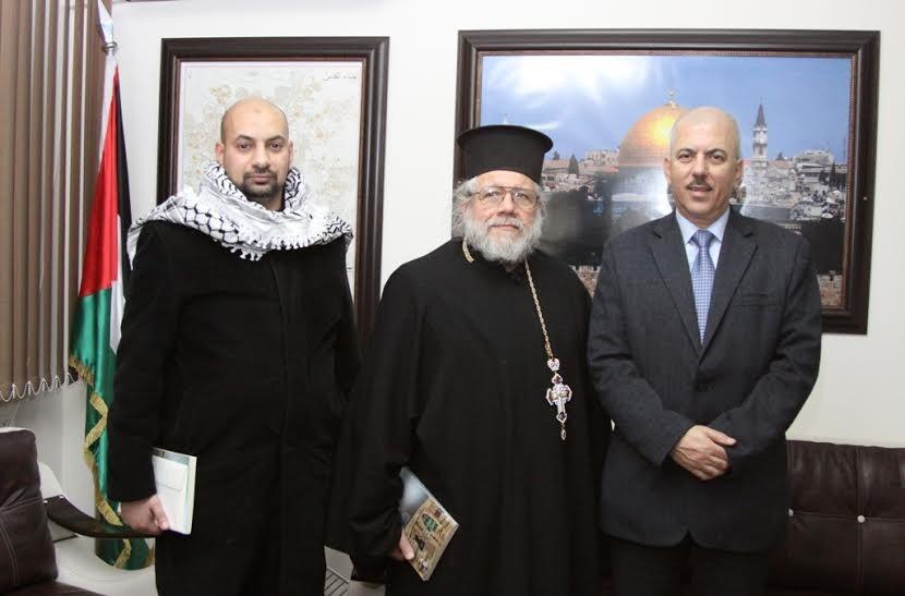 استقبل الأمين العام للهيئة الاسلامية المسيحية لنصرة القدس والمقدسات الدكتور حنا عيسى اليوم الثلاثاء راعي كنيسة الروم الملكيين للكاثوليك في مدينة رام الله الارشمندريت عبد الله يوليو والاستاذ سعد خليل من مفوضية العلاقات العربية والصين الشعبية في حركة فتح في مقر الهيئة بمدينة رام الله.