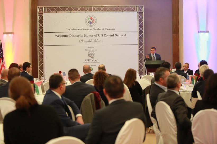 عقدت الغرفة التجارية الفلسطينية الأمريكية، يوم الخميس 21/1/2016، حفل استقبال وعشاء للقنصل الأمريكي العام دون بلوم، في فندق الموفنبيك برام الله.