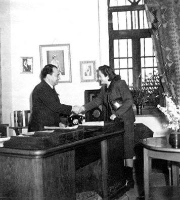 المطربة اسمهان الاطرش في زيارة لدار الاذاعة الفلسطينية “هنا القدس” ويقوم باستقبالها مدير الاذاعة عزمي النشاشيبي في مبنى الاذاعة في شارع مأمن الله في القدس عام 1944.