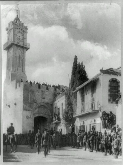 باب الخليل بوابة يافا لحظة دخول قوات الاحتلال البريطانية عام 1917 القدس لاحظ على يسار الصورة برج الساعة العثماني التي هدمته قوات الاحتلال البريطاني