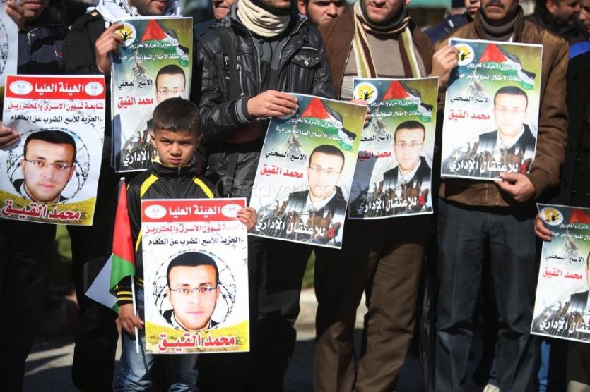 طالب مشاركون في وقفة تضامنية مع الأسير محمد القيق المضرب عن الطعام منذ 89 يوما، نظمتها وزارة الإعلام والمكتب الحركي للصحفيين في محافظة قلقيلية، اليوم السبت، بضرورة تحرك المؤسسات الدولية والحقوقية لإنقاذ حياته وإنهاء الاعتقال الإداري.