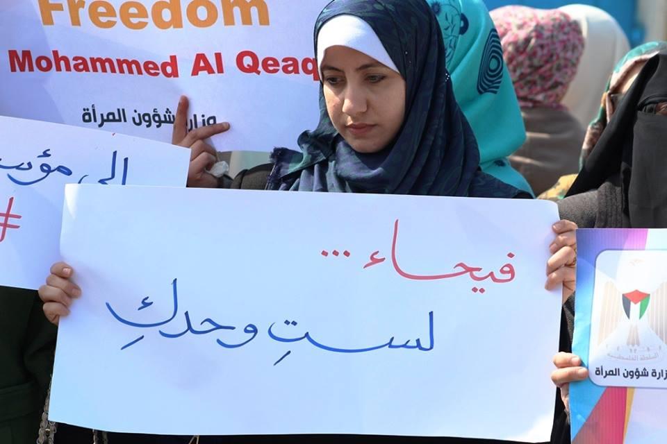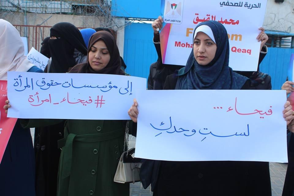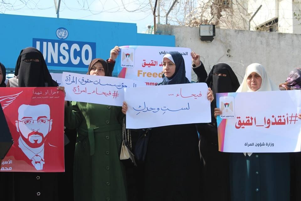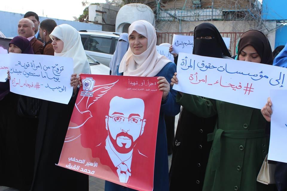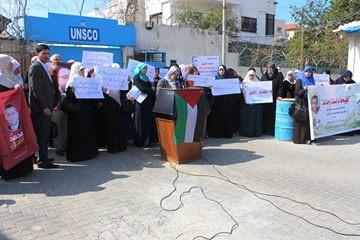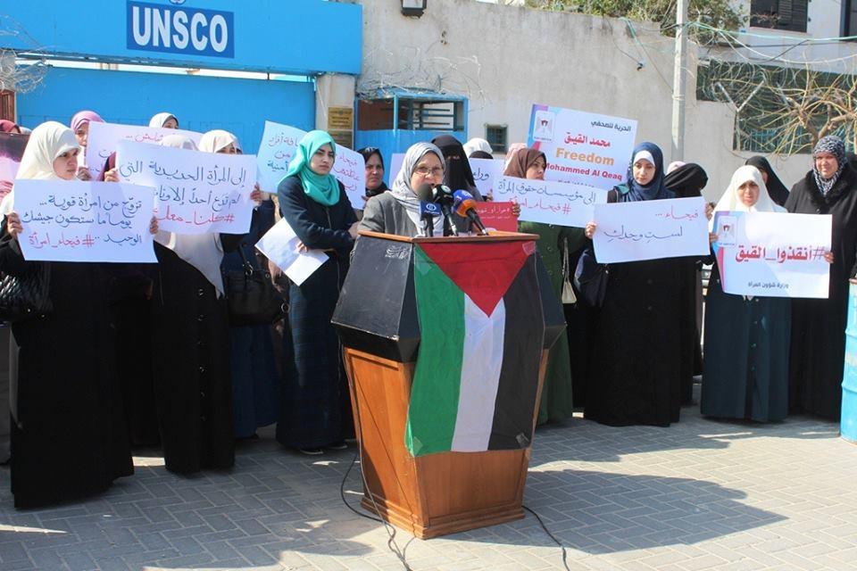 نظم منتدى الإعلاميين الفلسطينيين ووزارة شؤون المرأة وعدد من الصحفيات وقفة تضامنية أمام مقر الأمم المتحدة بغزة اليوم الأحد، دعمًا وإسنادًا للصحفية فيحاء شلش زوجة الأسير الصحفي محمد القيق، والمضرب عن الطعام منذ 3 أشهر.