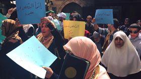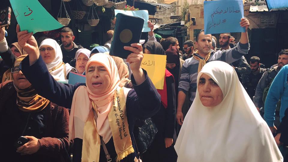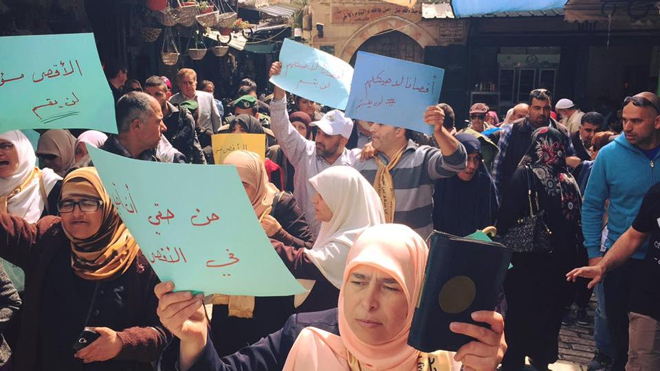 ورفع المشاركون لافتات كتب عليها "من حقي أن أصلي في المسجد الأقصى"، و "الأقصى مسؤليتي، لن يقسم"، وعلت أصواتهم بشعارات تندد سياسة الإحتلال العنصرية بحقهم وذلك بعد منعهم من الدخول الى المسجد الأقصى.