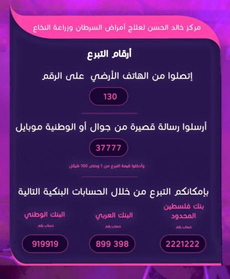 بلغت قيمة التبرعات لصالح بناء مركز خالد الحسن لمعالجة أمراض السرطان وزراعة النخاع حتى الليلة ال 10 مليون دولار و 12 مليون شيكل.