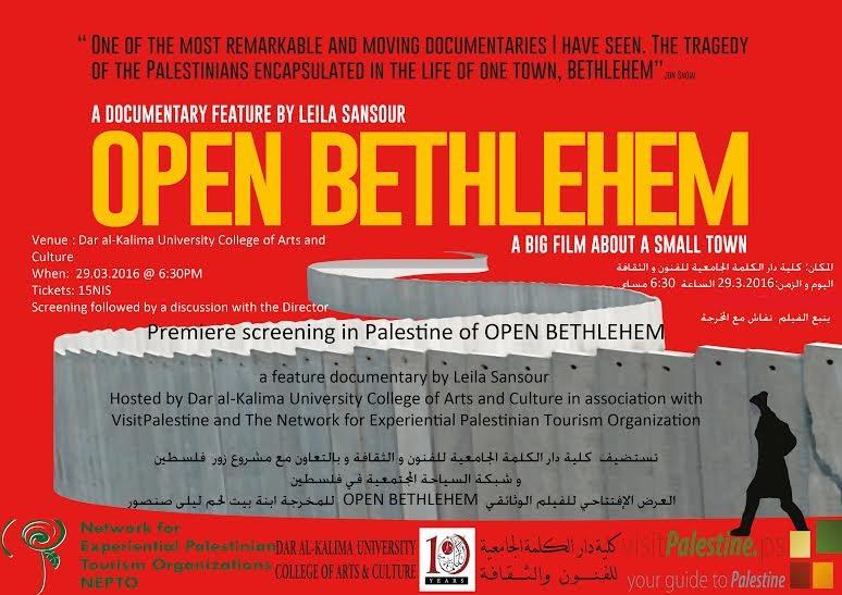 تستعد كلية دار الكلمة الجامعية للفنون والثقافة في مدينة بيت لحم وبالتعاون مع " مشروع زور فلسطين" و" شبكة السياحة المجتمعية في فلسطين" لإفتتاح العرض الاول لفيلم "بيت لحم " للمخرجة ليلى صنصور، وذلك يوم الثلاثاء الموافق 29 اذار ٢٠١٦ في تمام الساعة 6:30 مساء في مسرح دار الكلمة الجامعية.