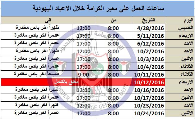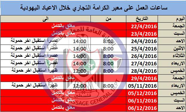 اعلن مدير عام الادارة العامة للمعابر والحدود نظمي مهنا عن اجراء تعديل في ساعات عمل معبر الكرامة في كلا الاتجاهين خلال فترة الاعياد اليهودية كما هو موضح ادناه :-