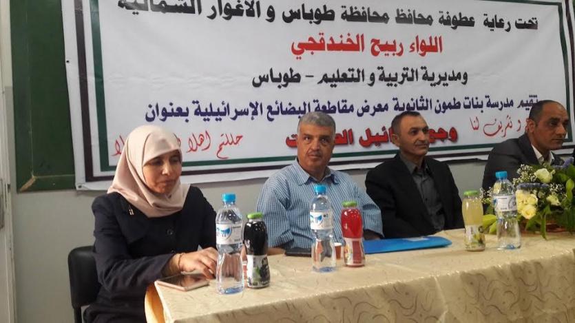 واشاد دراغمة ممثل محافظة طوباس بجهد المدرسة وقطاع التربية والتعليم في المحافظة مؤكدا ان المقاطعة هي فعلا موجعة ويجب ان نشجع المنتجات الفلسطينية ونمنحها الافضلية، ولعل القرار المتعجرف بمنع الشرمات الفلسطينية من التسويق في القدس المحتلة، والاجراءات التعقيدية التي تمارس ضد المنتجات الفلسطينية، وان محاربة منتجات المستوطنات قضية محورية مهمة وأن لا نسمح ان تصبح اسواقنا مكبا لنفاياتهم وتسبب اضرارا صحية وبيئية.