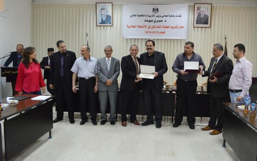 كرّمت وزارة التربية والتعليم العالي، اليوم الأربعاء، طلبة مؤسسات التعليم العالي الفلسطينية المشاركين في الأنشطة الطلابية للعام 2015-2016 في الضفة وغزة، وذلك خلال حفل نظمته دائرة الشؤون الطلابية برعاية وحضور وزير التربية والتعليم العالي د. صبري صيدم وأسرة الوزارة وممثلي مؤسسات التعليم العالي وبالتواصل عبر تقنية الفيديو كونفراس مع قطاع غزة.