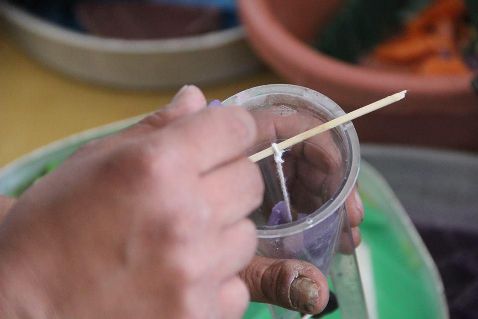 تمر مرحلة صناعة الشمع بعدة مراحل تبدأ بتسييح الشمع ثم تجهيز القوالب، تليها مرحلة وضع الملتينة والمسلة حتى يجهز القالب للصب، ثم توضع الصبغات وبعدها الصب، وبعد أربع ساعات يستخرج الشمع من القالب، ثم تنقل لمرحلة الكوي، وجميع هذه المراحل يقوم بها الطلبة ذوي الاعاقة باستثناء مرحلة الكوي كونها تشكل خطورة.