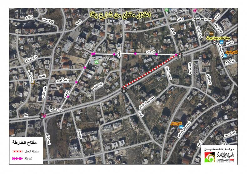 تعلن بلدية رام الله عن اغلاق مقطع من شارع يافا، وذلك للقيام بأعمال تأهيل خطوط الصرف الصحي، بالإضافة إلى أعمال الأرصفة، ومن المقرر أن يباشر المقاول أعمال المشروع من صباح يوم الجمعة ( 27/5/2016) حتى صباح يوم الأحد 29/5/2016.