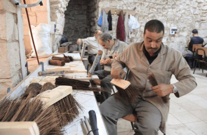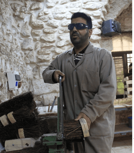 عند مرورك من طريق الآلام "عقبة المفتي" في البلدة القديمة بالقدس قد يلفت انتباهك المشغل المتواضع على يمينك، بحجارته المعبقة برائحة الماضي، والأخشاب المتناثرة داخله، التي تختلط مع صوت الضجيج وبعضا من منتجات ثانوية أخرى ليكون المنتج "مكنسة، أو فرشاة"، يعملون منذ الصباح الى العصر بلا توقف، تتحول أيديهم الى آلة تتحرك بسرعة بذات الطريقة لمرات ومرات، وعيناهم موجهة للأمام لا الى القطعة في أيديهم، وقد لا يلفت انتباهك كل ذاك، لكن أحدهم يدخل الى هذا المكان يوميا ليقطع عهدا جديد مع نفسه ويتمتم في سره "أنا أنتج، أنا لست عاجزا"، يعمل لساعات دون أن يرى الحجارة ولا الأخشاب ولا شعر الخيل ولا حتى صديقه الذي يعمل بجانبه منذ سنوات، لكنه يشعر بكل ذلك، ويدخل بالرغم من أنه لا يستطيع قراءة اليافطة التي كتبت في أعلى ذاك المكان "جمعية المكفوفين العربية".