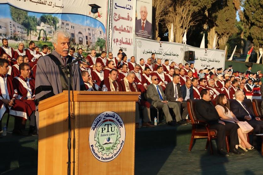 وأستطرد رئيس الوزراء: "نلتقي مرة أخرى في كنف "جامعة فلسطين التقنية"، التي تشكل حاضنة منتجة للعلم والمعارف وبيتا لمراكمة الخبرات والفكر الخلاق، رغم كل ما يتهدد طلابها وكوادرها ومسيرتها التعليمية وبنيتها من أخطار وتحديات، فهي الجامعة الوحيدة في العالم بأسره التي يتواجد داخل حرمها معسكر للرماية والتدريب العسكري، ويصادر الاحتلال الإسرائيلي ما يزيد عن مئتي دونم من أراضيها لصالح جدار الفصل العنصري ويعزلها خلفه، هذا بالإضافة إلى ما تتعرض له الجامعة من اقتحامات وتدمير لأراضيها، وانتهاكات واعتداءات متواصلة تطال طلبتها وهيئتها التدريسية. ولهذا، فقد تحول التعليم في رحاب خضوري ليس فقط إلى تعليم نوعي وهادف، بل ومقاوم أيضا، وليكون هذا الفوج من خريجيها فوج التعليم المقاوم."