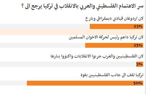 أظهر استطلاع اجراه موقع رايــة إن 50% من المصوتين ارجعوا سبب الاهتمام الفلسطيني الشعبي بمحاولة الانقلاب في تركيا الى ان الاخيرة تقف الى جانب الفلسطينيين بقوة.