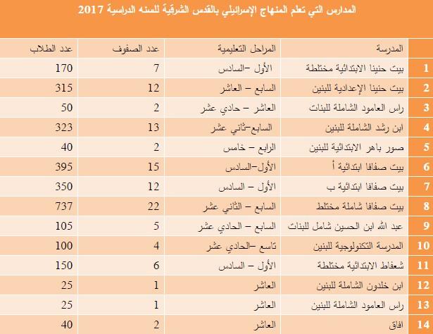 أدهم مناصرة- أعلنت "جمعية حقوق المواطن في اسرائيل" اليوم الاثنين، قائمة بأسماء ١٤ مدرسة مقدسية ستعلم المنهاج الاسرائيلي في عام ٢٠١٧.