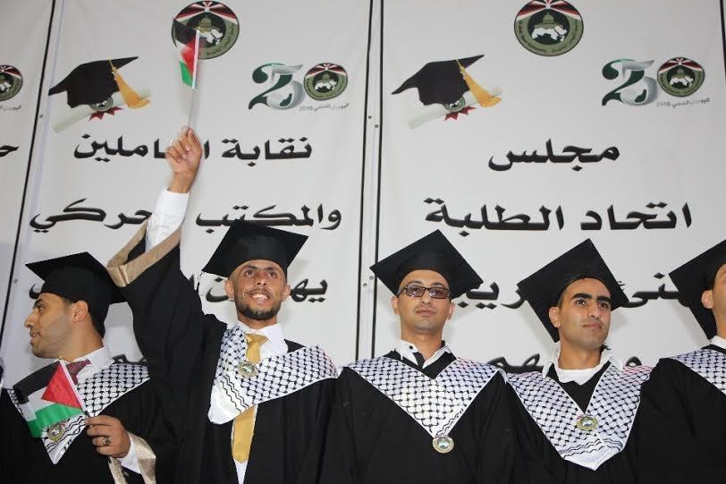 وقال رئيس مجلس الطلبة القطري زياد الواوي إن الجامعة تحتفل بكوكبة جديدة من الخريجين أمام مرأى الاحتلال الحاقد الذي ما زال يتوغل في اعتداءاته وحصاره ويسوق الذرائع للمضي في نهب الأرض.