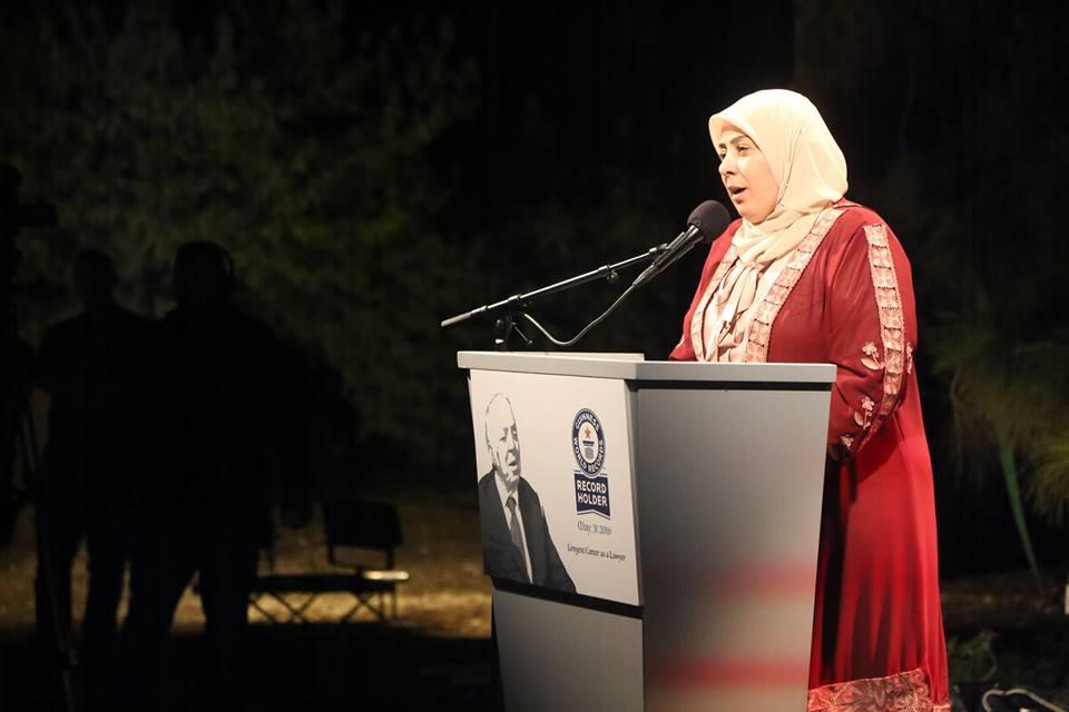 كلمة ممثلي موسوعة غينيس عرضت متلفزة على شاشة كبيرة توسطت الساحة الخارجية الساحرة لمبنى أثري يشي بعراقة المكان عله يليق بعراقة التجربة التي يمثلها المحامي شحادة المحتفى به ليس من قبل الأهل والأصحاب والتلاميذ فحسب، بل من قبل الرئاسة الفلسطينية ممثلة بمحافظ رام الله والبيرة ليلى غنام، والحكومة الفلسطينية ممثلة بوزير العدل على أبو دياك، وعدد من النقابات والهيئات والمؤسسات.