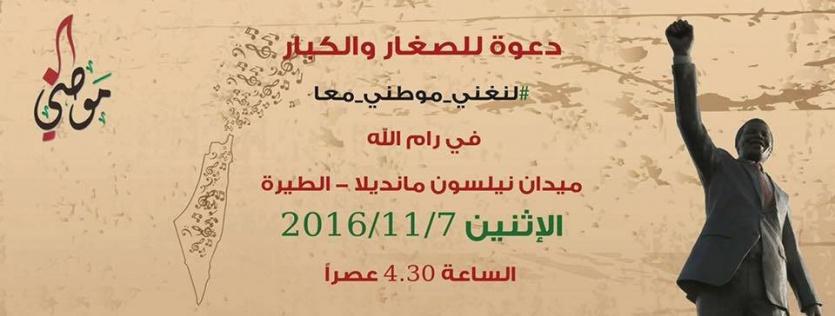 ينظم نشطاء ومثقفون فلسطينيون مساء الاثنين القادم فعالية مركزية لغناء "نشيد موطني" في مدينة رام الله وسط الضفة الغربية المحتلة، للعام الثاني على التوالي بعد أن اجتمع الاف الفلسطينيين في أنحاء مختلفة من العام الماضي في فعالية مشابهة.