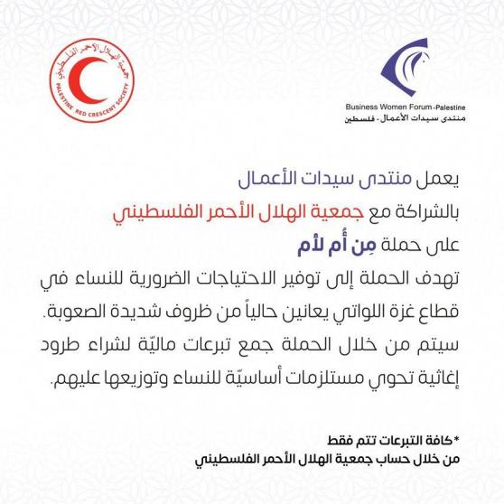أعلن منتدى سيدات الأعمال بالتعاون مع جمعية الهلال الأحمر الفلسطيني، عن إطلاق حملة "من ام لأم" والتي تسعى لجمع التبرعات بهدف توفير طرود تحتوي على المستلزمات الأساسية للنساء في غزة.